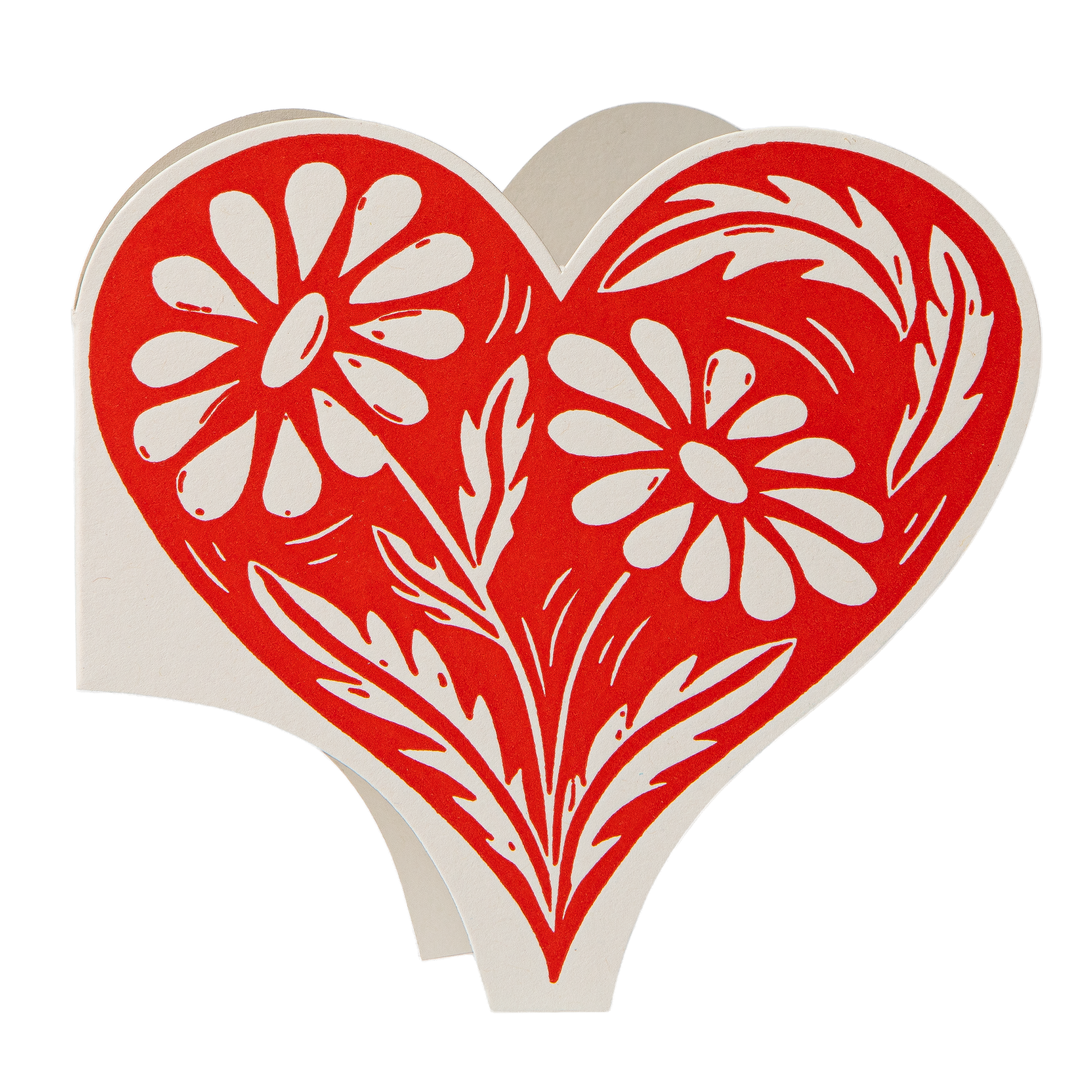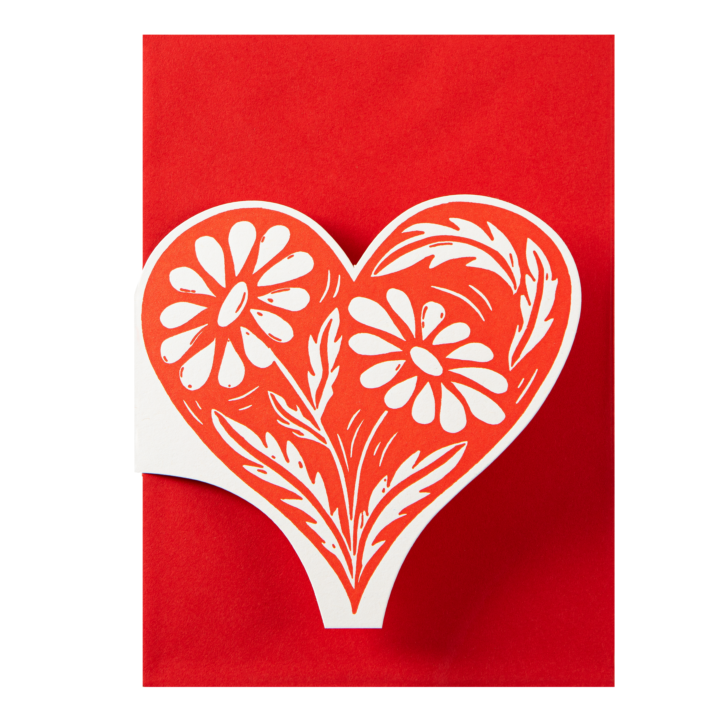 Our letterpress cut-out card featuring a red heart that includes white botanical detailing. Why send a boring square card when you could send one of these cut-out beauties? They look so good perched on a dresser or mantelpiece, you’ll never want to pop them in the recycling. Receiving one in the post is a little moment of joy.