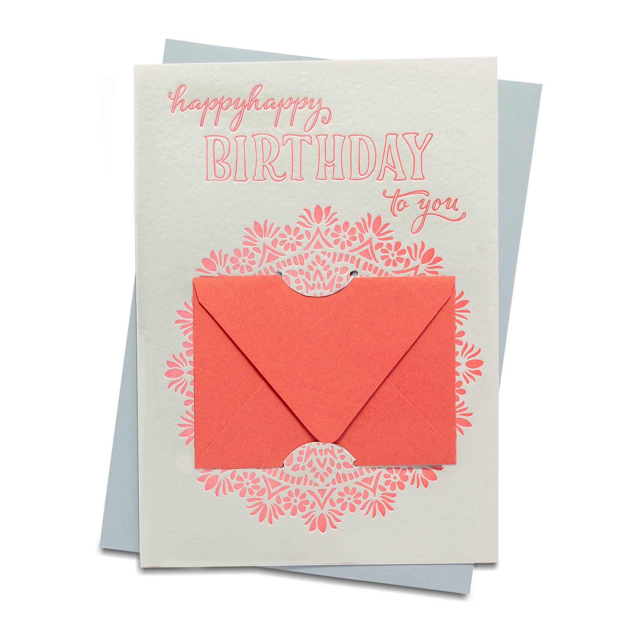 Gift cards are the easiest gift to give and are always well received. Our Gift Card Holders are the perfect way to dress them up! Place your gift card, check, or cash in the tiny envelope, which nestles into the slots on our letterpress card. Remove the tiny envelope to reveal a bonus message underneath! “Happy Happy Birthday!” Bonus Message - "Enjoy it!" Details: - A7 (5” X 7”) letterpress printed flat card with tiny gift card envelope - coordinating A7 envelope - Packaged in a cello sleeve with label that says “Gift Card Holder” and also the bonus message