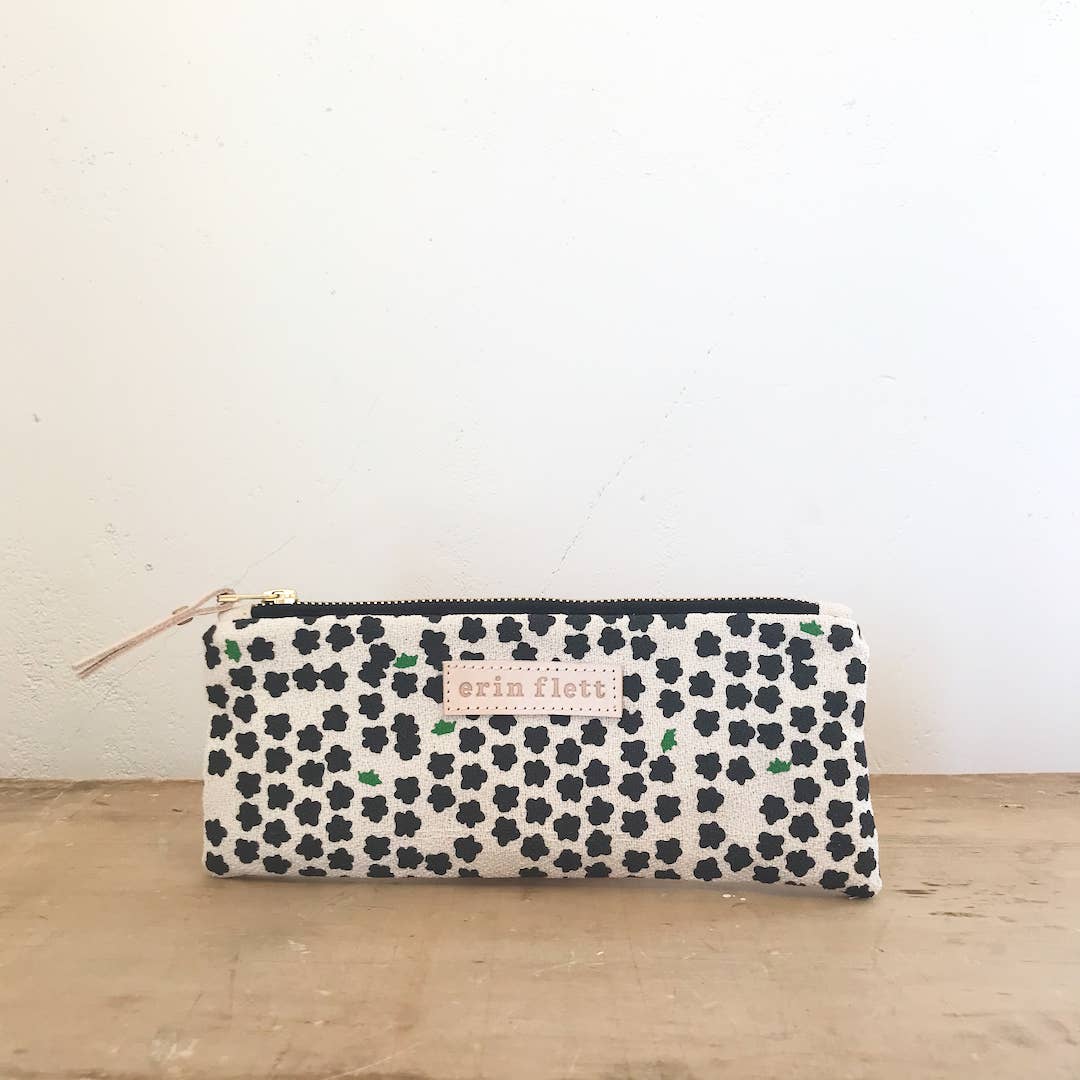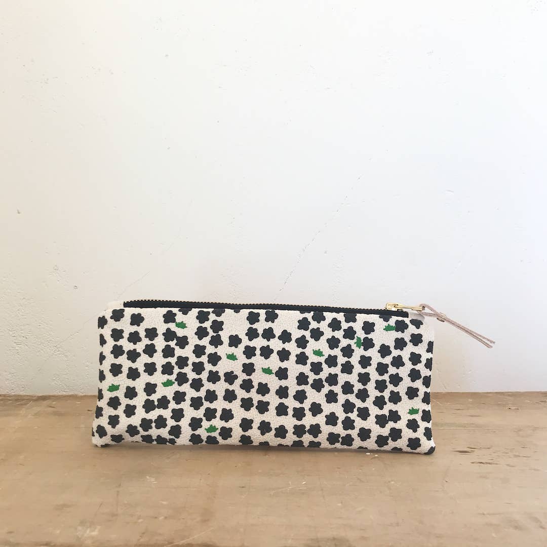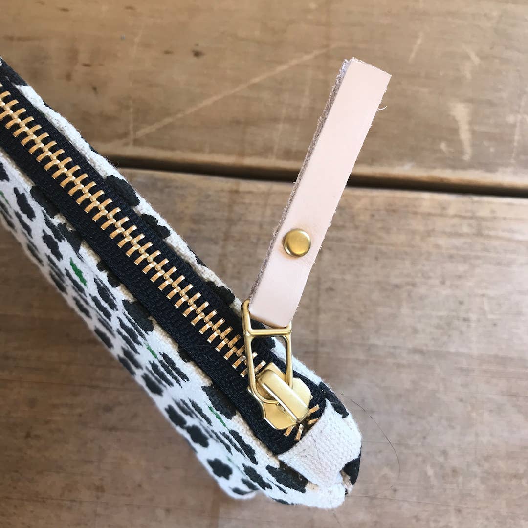 These little gems are hand printed and sewn here in Maine. The quality in the details is something you will see and feel. We look at every opportunity to make these beautiful and practical.  Details: Size: Flat 9" x 4", Round 9" x 2” Material: Cotton Barkcloth, Cotton Canvas Lining, Brass Zipper, Leather Bell Pull Care: Machine wash cold. Dry flat. Iron if you wish.