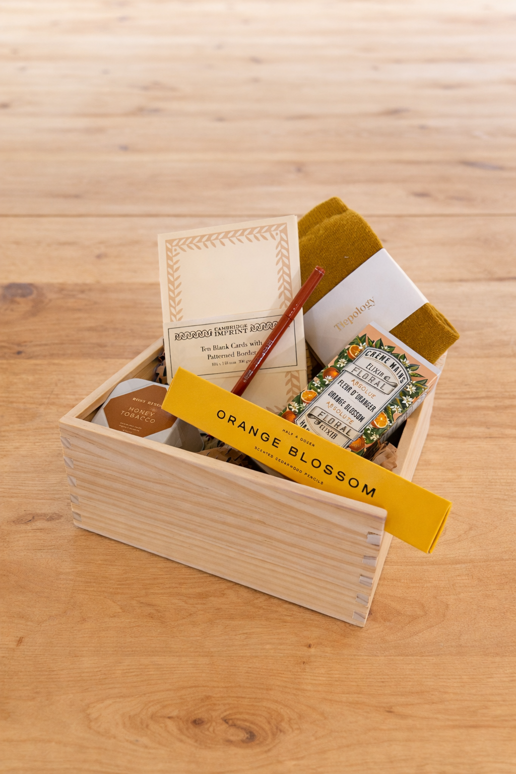 All items packaged beautifully in our wooden crate, tied up with a seasonal ribbon. We'll fill out a card with a message of your choice if we are shipping directly to the recipient.