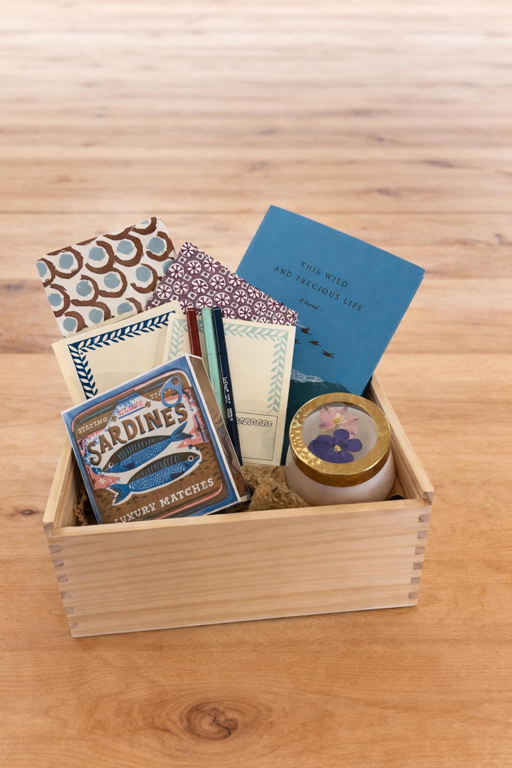 All items packaged beautifully in our wooden crate, tied up with a seasonal ribbon. We'll fill out the card with a message of your choice if we are shipping directly to the recipient.