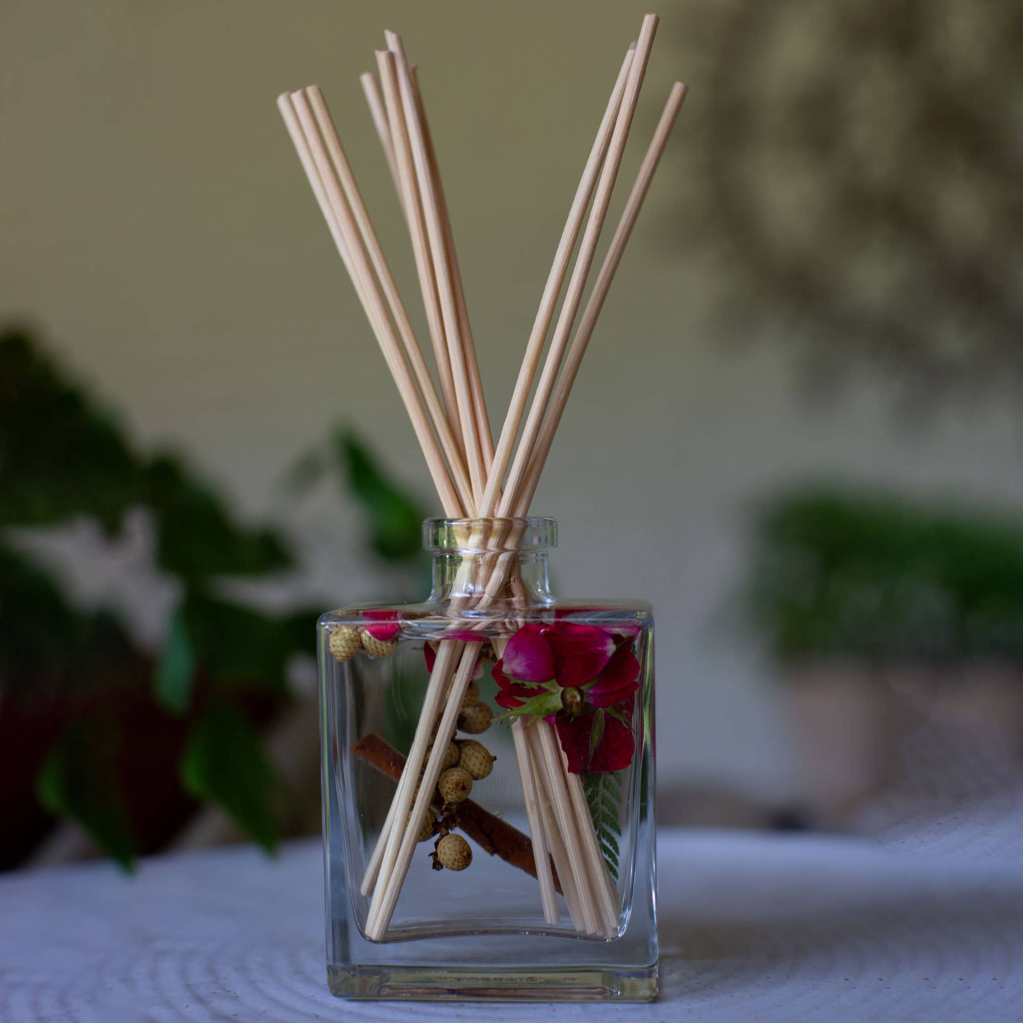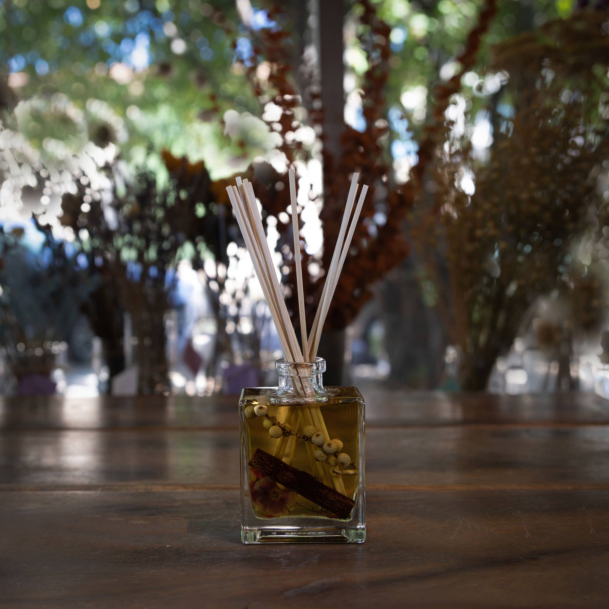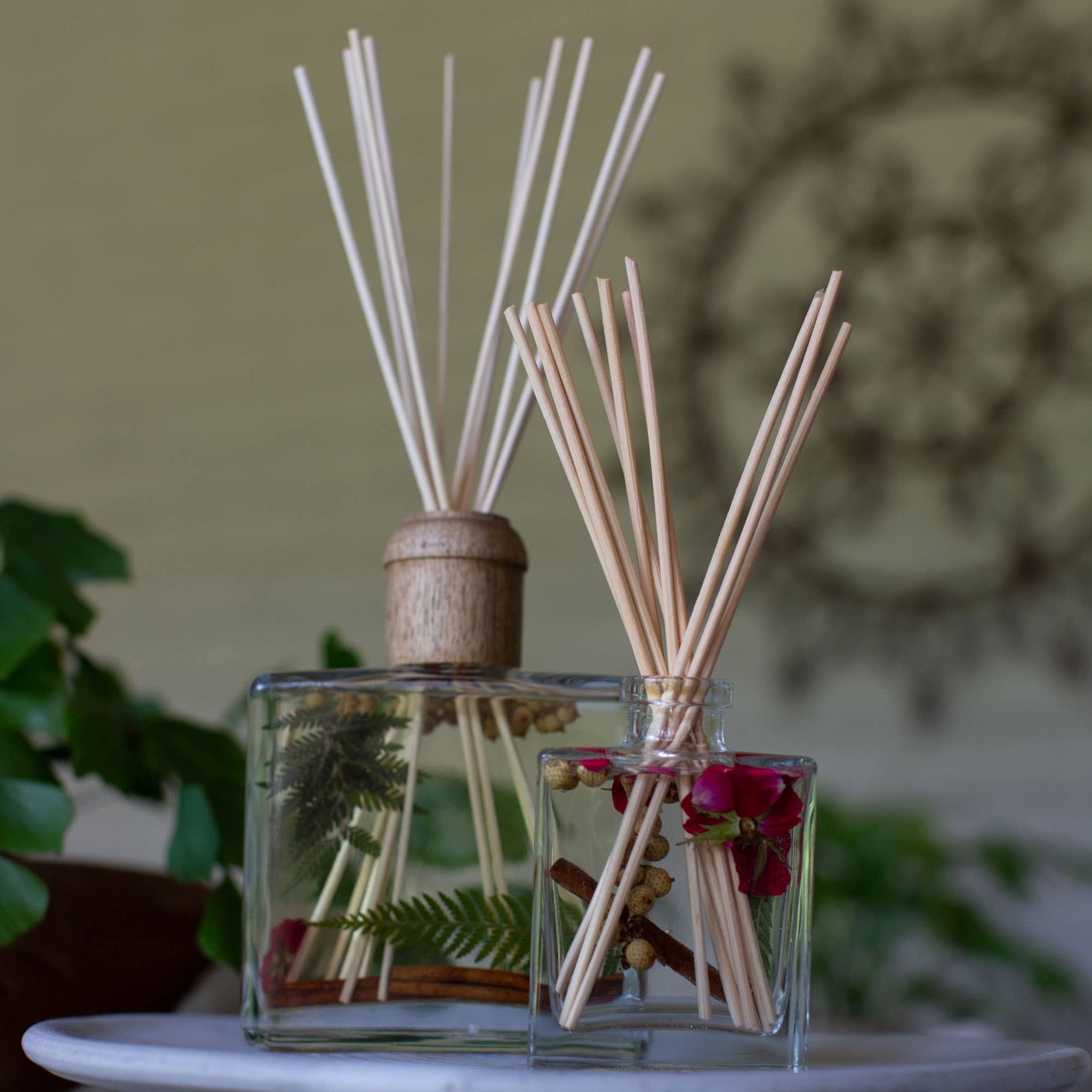 Gorgeous packaging is the perfect complement to dramatic square bottles filled with real spices, fruit and botanicals. Every natural element you see inside the glass vessel is delicately placed there by hand. Lovingly packaged with 10 reed sticks to fragrance your space without a flame.