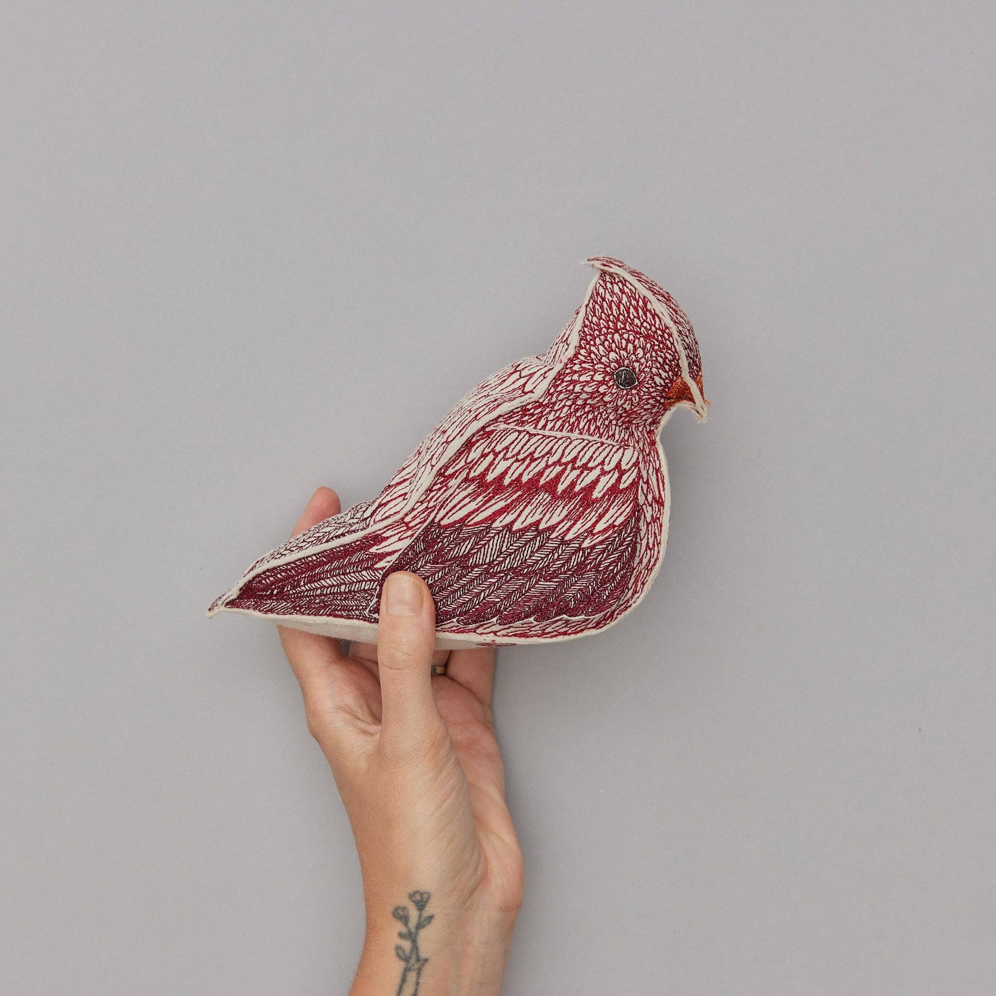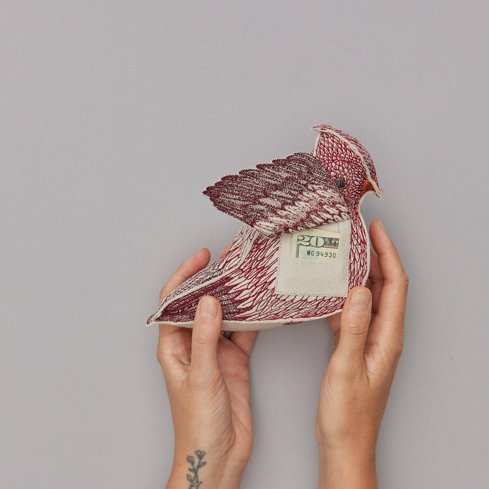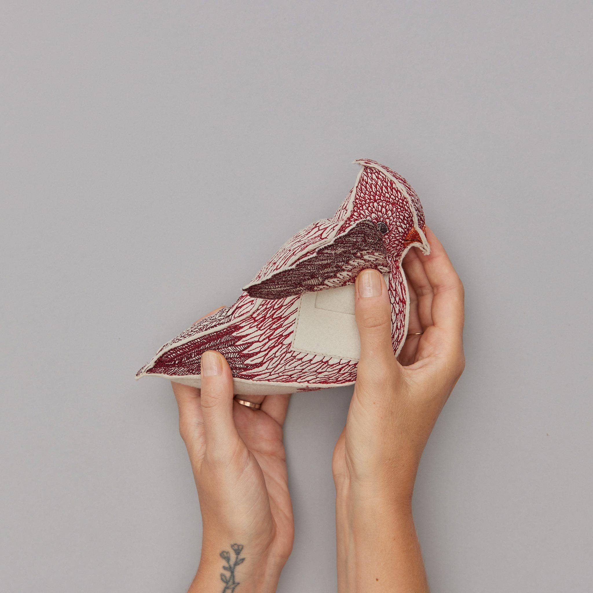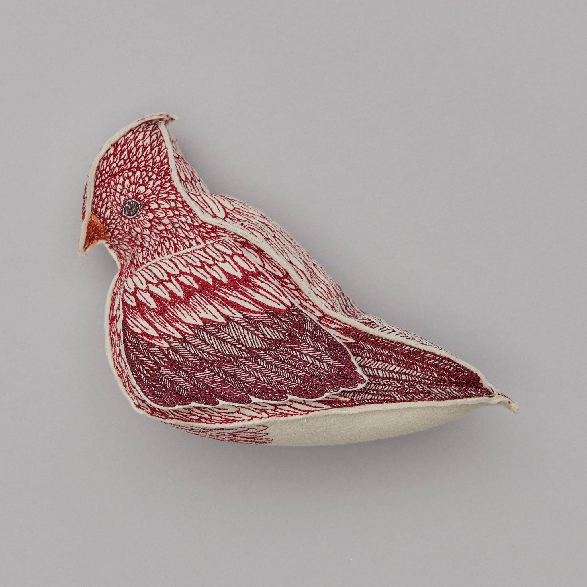 Cardinals are often the only natural bright spot found outside in the winter. Their radiant plumes make them a symbol of hope, love, and positivity. Spread the cheer this year with our new sculptural cardinal. Designed to be a special keepsake item, the Cardinal of Hope has a pocket under each wing. Lift up the Cardinal’s wings to place a special note, small gift, or memento. Our unique Cardinal is crafted from felt and features detailed embroidered feathers on all sides.