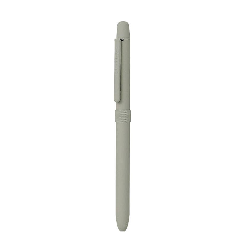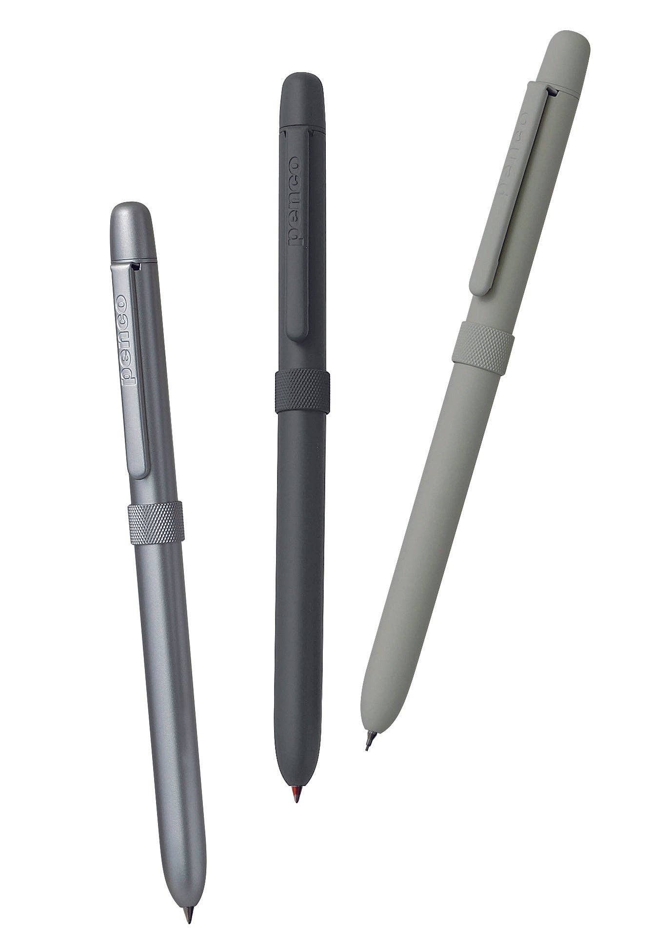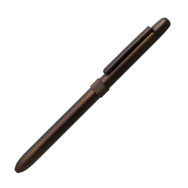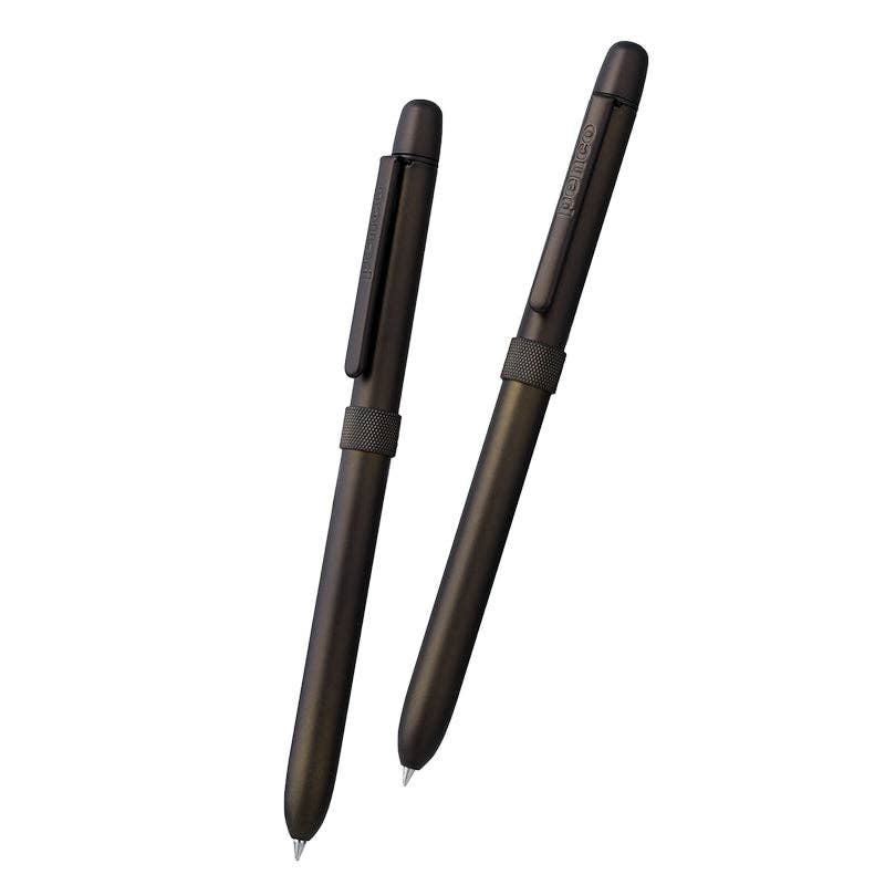 Knurled slim brass body in mat color is just right weighted. Black and red ink, pencil and eraser.