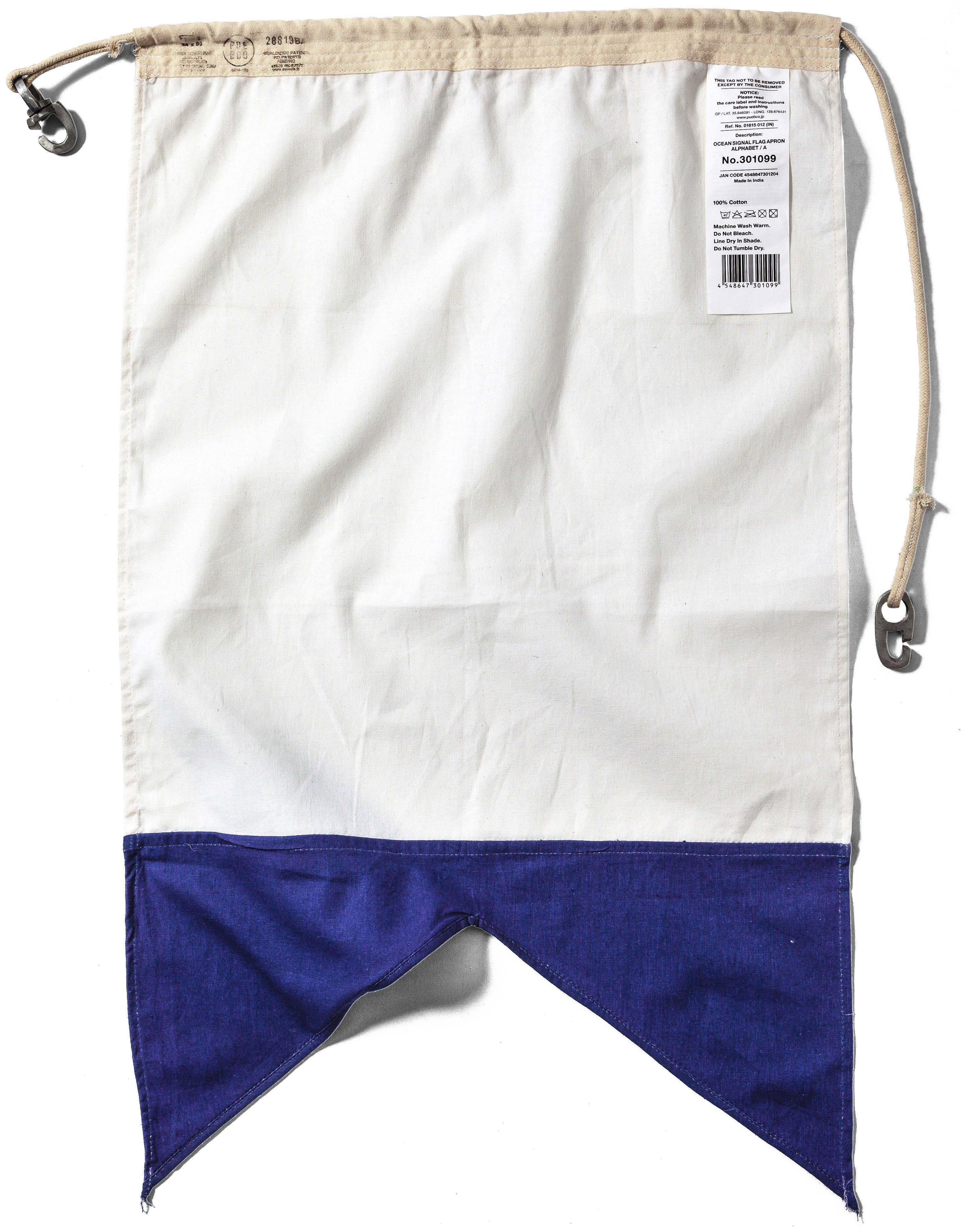 "What if we made an apron out of the flags they use for ships? The original flags each had an alphabet letter on them and were used to express words by matching the letters (flags) together. We wanted to take something with an extraordinary purpose and turn it into an ordinary, practical item. We were first drawn to the cast iron parts designed to easily connect ropes together without it coming undone. The desire to remake this dynamic yet delicate part is what led us to this item. We then selected cloth that doesn't easily fade but also feels like a flag. It turned out that it was difficult to match the quality of the original cast iron parts.