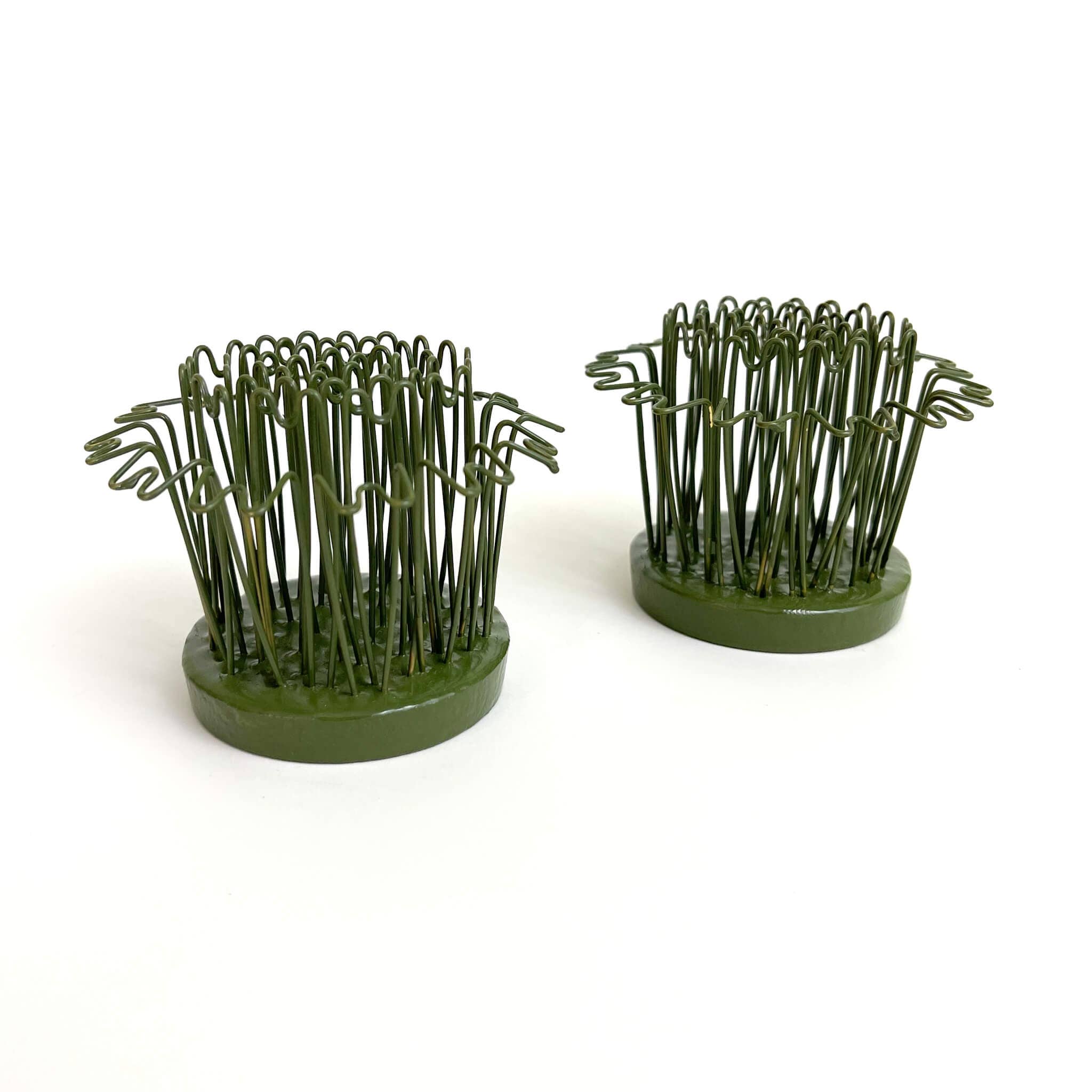 The Hairpin Holder features looped pins for maximum hold and is perfect for fresh, dried, or silk flowers. The Hairpin Holder can be reused for decades and is a durable alternative to floral foam. * Sold in packs of 2 * All hairpin holders are 2-1/2” tall * Available in Green * Heavy base designed to keep arrangements secure * Flexible brass pins allow you to design from any angle * Made with rust-free materials * Made in the US The Floral Genius flower frogs are constructed with a lead base and brass pins.