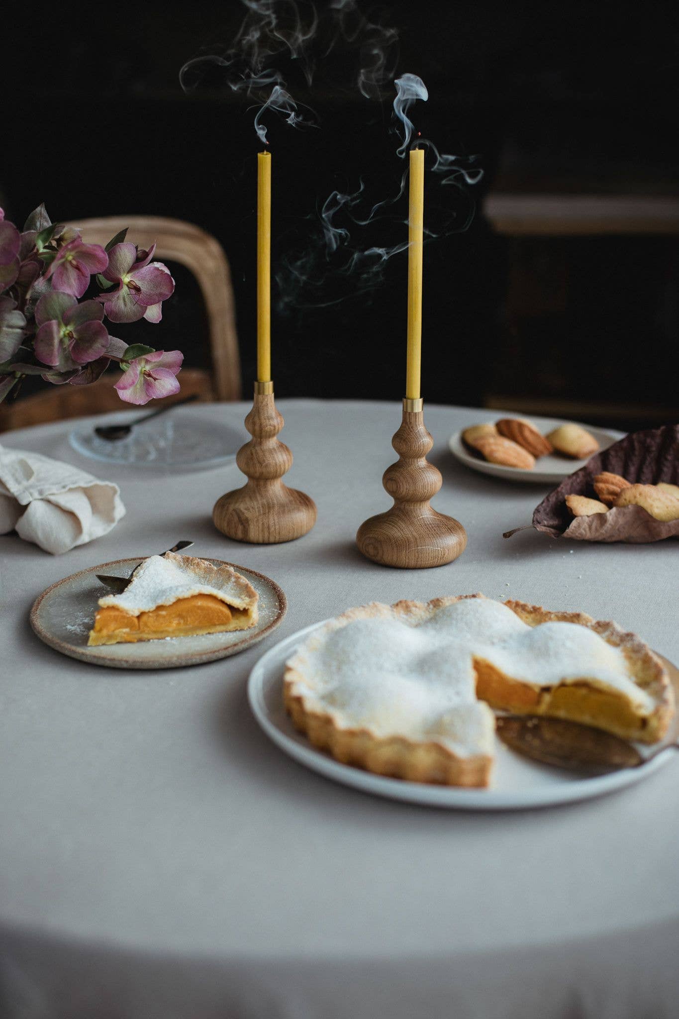 Oiled oak candle stick holder with brass detail. Thanks to the unique design of the detail, it can hold candles of two sizes, any from OVO Things range. Made from natural material these candle holders may differ slightly in colour and pattern of wood; we hope you will enjoy your own.